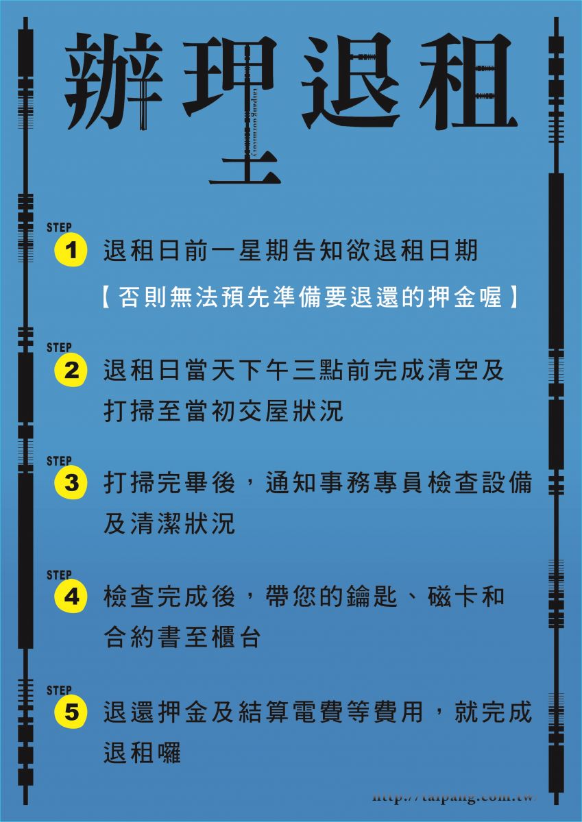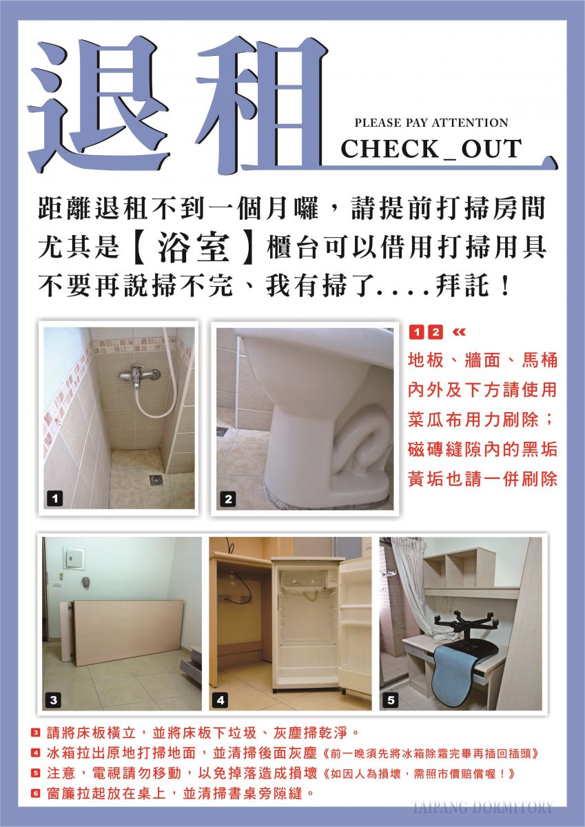 每間房間我們必須再次檢查、補強清潔及維修才能將房間交給下一個房客,請各位體諒小編跟團隊們,要好好打掃並盡快完成退租唷!拜託了!