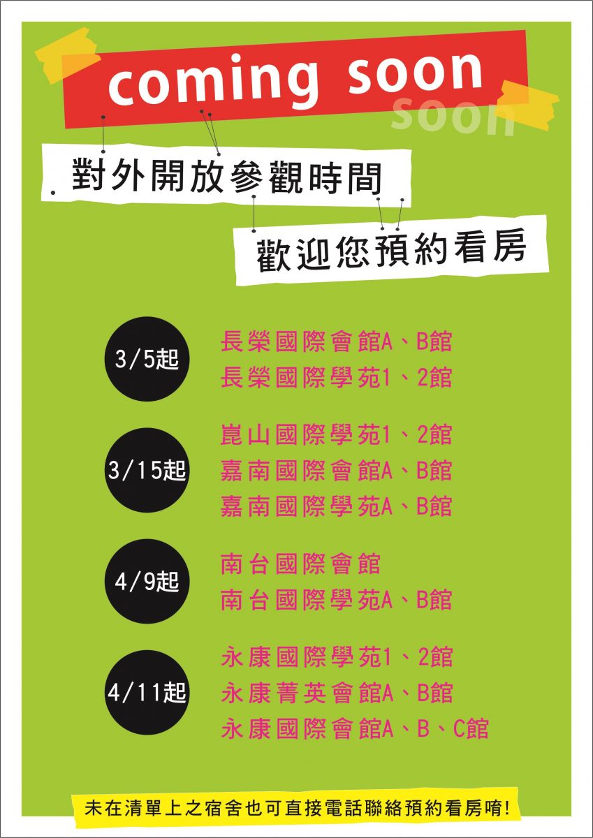 快來!快來!我們即將對外開放預約新學期房宿囉!