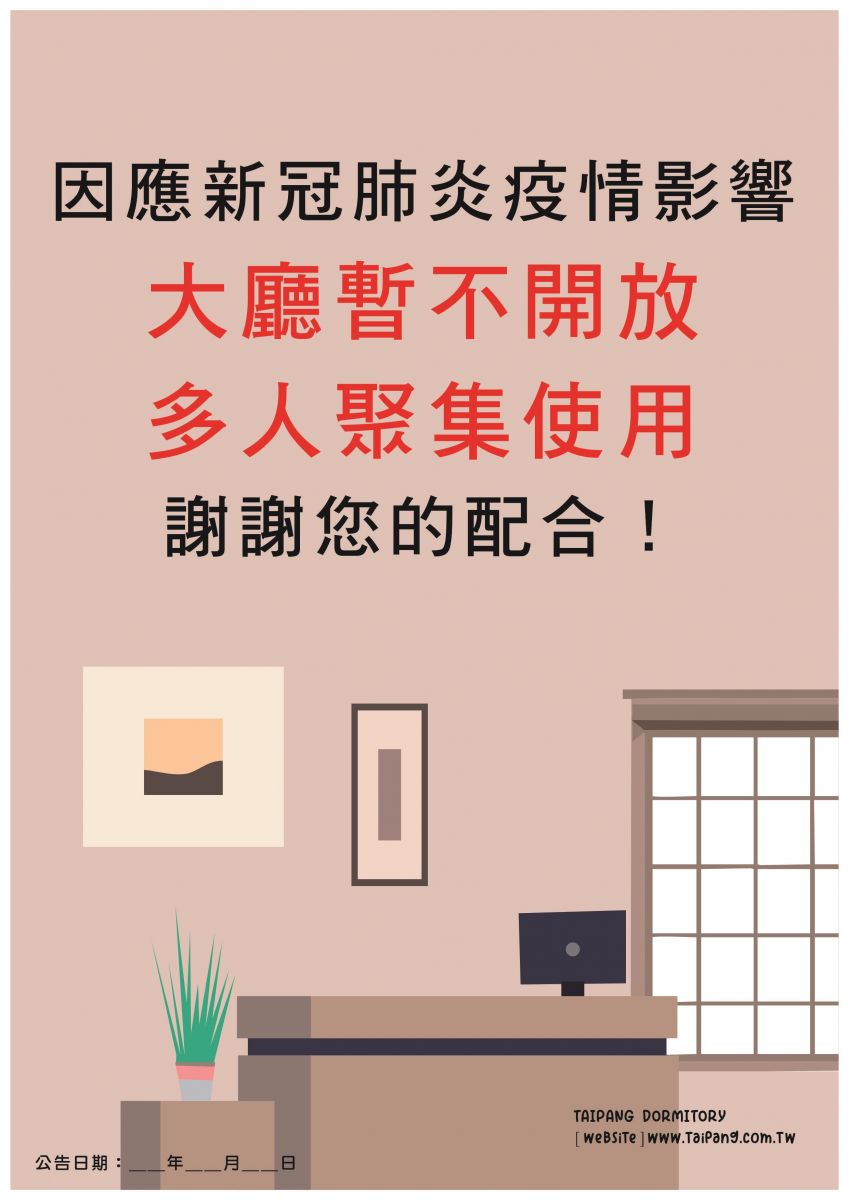 為避免群聚於密閉空間,即日起大廳將無限期暫停開放,日後將視疫情狀況恢復使用,造成您的不便敬請見諒!