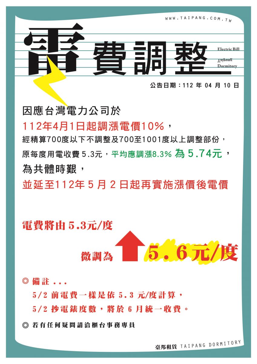 因應台灣電力公司於112/04/01調漲電價